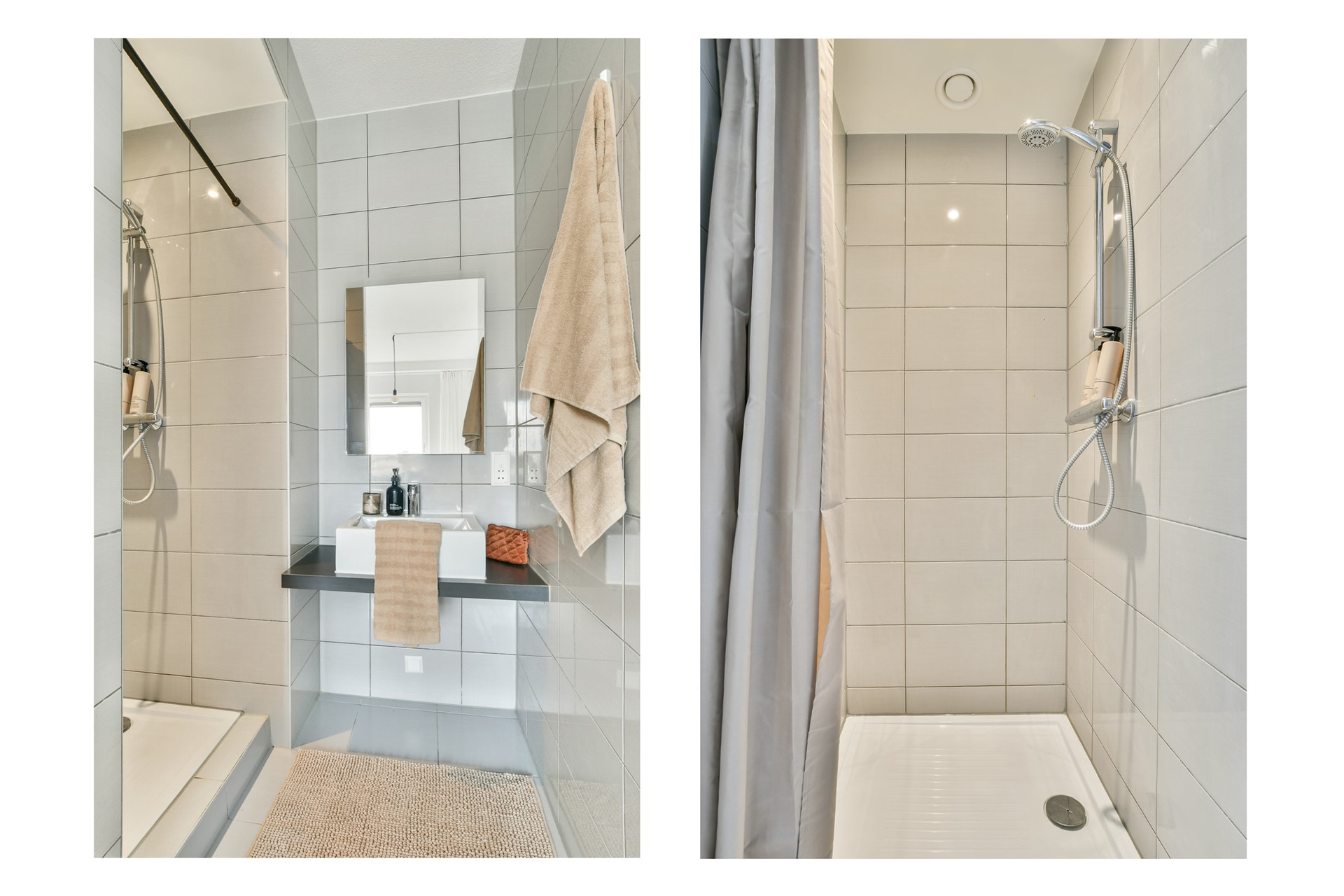 Naast de keuken ligt de slaapkamer, een fijne en rustige ruimte met voldoende plek voor een tweepersoonsbed en een kledingkast. Direct aangrenzend vind je de badkamer, compleet met douche en wastafel. De nette afwerking geeft het geheel een frisse uitstraling. Naast de badkamer bevindt zich een separaat toilet, wat het wooncomfort vergroot. Ook is er een inpandige berging aanwezig met aansluiting voor wasmachine en droger – praktisch en netjes uit het zicht.